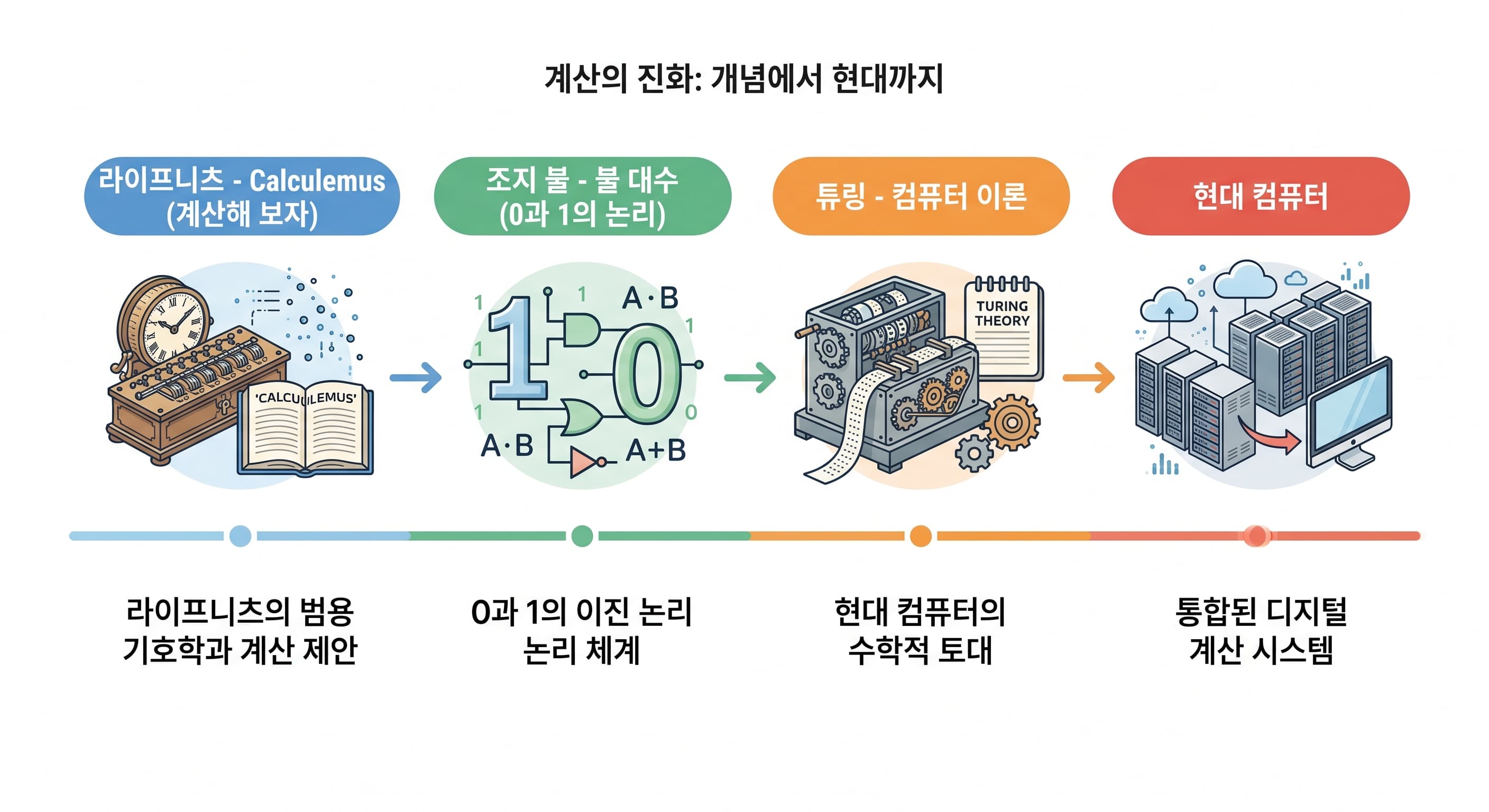 지금 들으면 좀 웃기기도 합니다. 정치 토론을 계산으로 해결할 수는 없으니까요. 하지만 이 발상이 논리학에 적용되면서 진짜 강력한 도구가 됩니다. 나중에 조지 불이 논리를 0과 1로 계산하는 불 대수를 만들고, 그게 현대 컴퓨터의 기반이 됩니다. 라이프니츠가 씨앗을 뿌린 셈이에요.